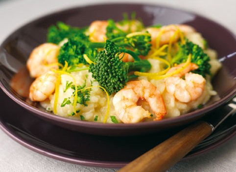 Mettez la moitié du beurre et de l’huile dans un wok, faites chauffer. Ajoutez l’oignon émincé et laissez colorer 4 minutes. Ajoutez le riz et la moitié du bouillon. Remuez régulièrement. Au bout de 10 minutes, ajoutez l’autre moitié du bouillon. Au bout de 10 minutes, ajoutez le vin, les crevettes et le bimi. Faites cuire à feu doux jusqu’à ce que le liquide soit évaporé et le riz cuit. Retirez du feu, ajoutez le beurre, assaisonnez de poivre et de sel. Servez dans des bols, parsemez de persil et d’un zeste de citron.