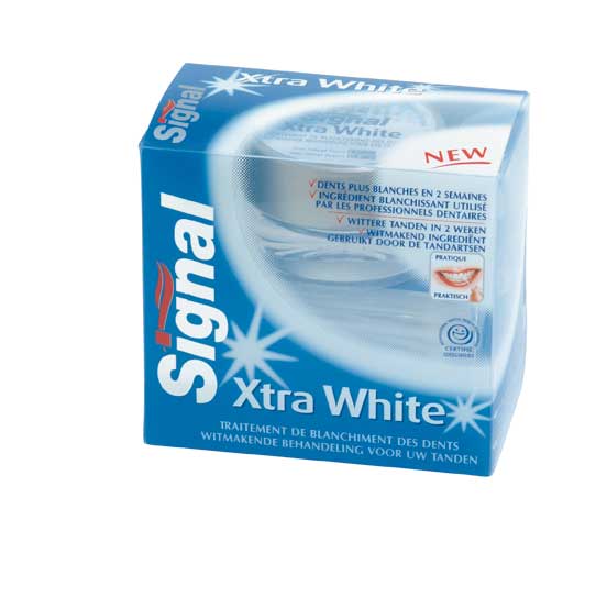Signal Xtra White, 15 € la boîte (1 pot de gel de 10 ml + 1 boîte de 30 applicateurs jetables + 1 notice d’instructions et l’Xtra White Test pour vérifier les résultats soi-même).