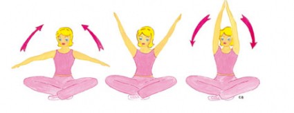 Assise en tailleur sur un siège, le dos droit, les bras tendus, montez les bras et ramenez-les en position initiale. Inspirez en montant les bras au dessus de la tête. Expirez en ramenant les bras. Cet exercice sollicite principalement les fixateurs de dos. Réalisez 5 séries de 10 répétitions. Pour chaque exercice, augmentez la charge chaque semaine.