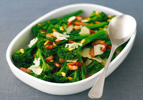 Pousses de bimi aux pignons, pancetta croustillante et parmesan Pour 4 personnes
