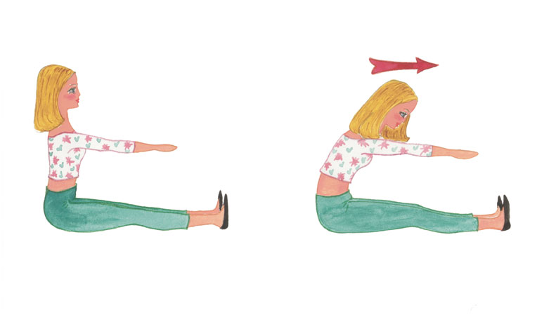 Assise, jambes tendues, pointes de pieds ramenées vers le corps, bras allongés vers les pointes de pieds.