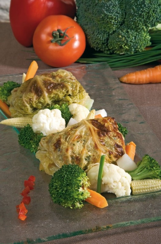 Coupez le cabillaud en petits dés. Mettez-le dans un saladier en y ajoutant le jus de citron, les 4 épices, la ciboulette, les baies roses, l'huile d'olive, le sel et le poivre. Mélangez le tout et réservez pendant 2 heures. Dans une casserole, faites chauffer le vin blanc et le fumet de poisson pendant 5 minutes à  feu doux. Après avoir lavé les feuilles de chou et les avoir essuyées avec un papier absorbant, disposez dans chacune d'elle une grosse cuillère de farce. Enroulez les feuilles de chou avec la farce en formant 16 petits paquets. Disposez-les sur une plaque allant au four et arrosez-les de fumet.