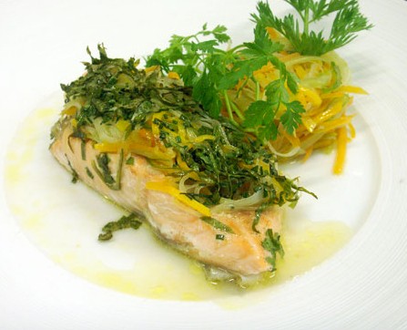 Préchauffez le four à 220 degrés ou thermostat 8. Préparez tous les légumes : épluchez, lavez, taillez le céleri, la carotte, le poireau en julienne régulière, étuvez le tout à l’huile d’olive à couvert, salez, poivrez et réservez. Faites suer l’échalote au beurre sans coloration. Détaillez 8 feuilles de papier aluminium et beurrez le côté mat. Posez le pavé de saumon, salez, poivrez, disposez l’échalote, les juliennes de légumes, la ciboulette ciselée, arrosez de Chablis Vieilles Vignes Daniel- Etienne Defaix. Refermez la papillote, posez sur la plaque du four et enfournez pendant 10 min. environ (suivant l’épaisseur du poisson). Servez aussitôt accompagné du restant des légumes verts montés en dôme et arrosé du jus de cuisson.
