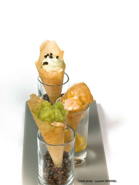 - Garnissez les cornettes avec le tartare de langoustines et surmontez avec 1 cs du mélange à la pomme. Dressez les cornettes dans un grand verre préalablement rempli de riz ou de semoule.