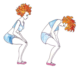 Debout, vous allez alterner deux positions : pour la première, placez les mains sur les genoux et fléchissez les jambes. Ayez le dos plat et dirigez les fesses vers l’arrière. Les bras sont légèrement fléchis. Pour passer à la deuxième position, arrondissez le dos, creusez le ventre, rentrez les fesses et amenez le menton à la poitrine en expirant. 10 mouvements suffiront.