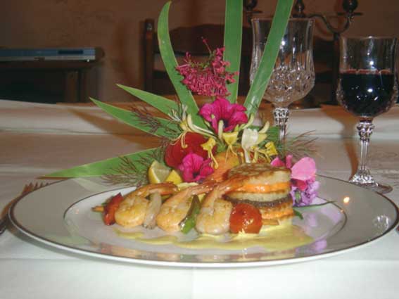 Épluchez la poire, l'échalote, le poivron vert et rouge, l'ananas, et réservez. Emincez l'échalote et les poivrons. Gardez les cubes de poivron et d'échalote pour les brochettes. Taillez en cubes la pomme, la poire, la mangue et l'ananas. Dans une casserole à feu moyen, faites revenir les échalotes et les poivrons émincés avec l'huile d'olive. Incorporez les cubes de pomme, poire, mangue et d'ananas ainsi que le curry, le piment de Cayenne et l'estragon. Mettez à feu doux afin de faire compoter les fruits. Incorporez la crème UHT, laissez réduire à feu doux 2 à 3 minutes. Mettez le tout dans un mixer, passez à la passoire. Remettez sur feu doux, assaisonnez avec le sel et le poivre, réservez au chaud. Décortiquez les queues de gambas. Faites les brochettes en finissant par la tomate cerise. Dans une poêle bien chaude avec de l'huile d'olive, faites cuire les brochettes, salez et rajoutez un peu d'estragon en en fin de cuisson. A savoir : ne poivrez pas vos aliments dans une poêle, mais après la cuisson, pour éviter que le poivre devienne acre. Rajoutez votre sauce.