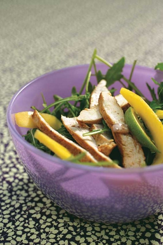 4. Ajoutez la salade, les échalotes et les lamelles de dinde dans le plat contenant la marinade et les mangues. Salez, poivrez, mélangez et servez avec de la coriandre coupée selon votre goût.