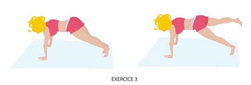 Cet exercice va permettre un renforcement des fessiers par extension de la hanche. Jambe en rotation externe. En appui sur les mains et une jambe demi fléchie, tête dans le prolongement du dos.