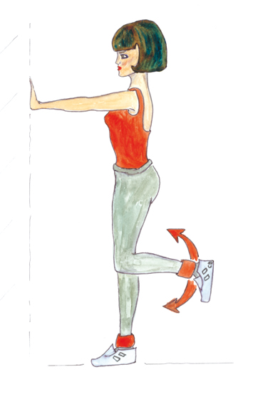 Placez un lest de 2 à 3 kilos autour des chevilles. Debout, posez les mains contre un mur. Décollez le pied droit du sol. Et, tout en soufflant, fléchissez la jambe droite pour amener le talon droit à la fesse droite. Inspirez en revenant à la position de départ.