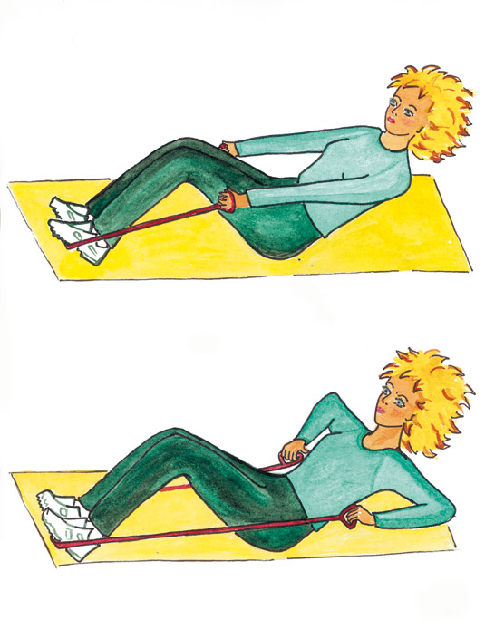 Asseyez-vous en position de rameur, les jambes légèrement fléchies, le dos droit, légèrement penché vers l’arrière. Placez le milieu de l’élastique sous votre plante des pieds : seuls les talons sont posés sur le sol. Prenez les extrémités de l’élastique dans chaque main. En position de départ, vos bras sont tendus en direction de vos pieds. Lors du travail, vous devez ramener vos mains à hauteur de votre poitrine (vos poings sont à environ 10 centimètres de votre torse). Surtout, gardez toujours le dos droit et effectuez 10 tractions.