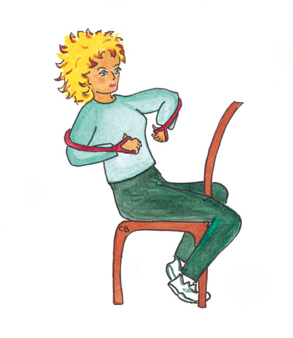 Placez l’élastique dans votre dos, une extrémité dans chaque main, les bras légèrement pliés vers votre poitrine. Réalisez des rotations du bassin, de gauche à droite puis de droite à gauche en veillant à ce que le reste du corps reste fixe.