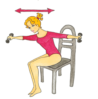 Assise sur une chaise, avec des lests de 500 g dans chaque main, penchez-vous en avant avec un angle d’environ 45 °. Votre dos doit être bien droit. Tout en le conservant ainsi pendant la durée de l’exercice, venez faire se toucher vos mains devant vous, puis derrière vous. Vos bras doivent rester le plus tendus possible.