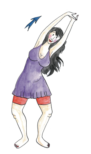 Toujours debout, les bras levés et tendus, fléchissez la taille vers la droite puis vers la gauche, en vous étirant doucement le plus possible. Prenez bien garde à ne pas pencher votre buste vers l’avant, mais à le garder dans la direction de vos bras. Maintenez cette position 20 secondes, et refaites l’exercice 3 fois de suite.