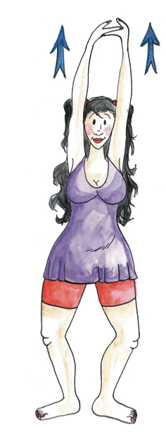 Tenez-vous debout, les jambes écartées et un peu flechies. Élevez vos bras en les tendant verticalement, les paumes des mains tournées vers le plafond. Pendant 20 secondes, vous maintiendrez cette position, en étirant doucement vos bras. N'étirez que vos bras, vos jambes doivent rester légèrement fléchies. Refaites l’exercice 3 fois de suite.