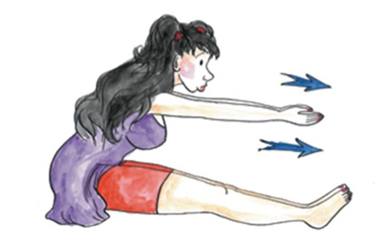 Assise par terre, tendez les jambes devant vous et gardez-les serrées. La tête redressée, vos bras sont tendus devant vous et parallèles à vos jambes. Penchez-vous vers l’avant, bassin droit, et maintenez cette position pendant 30 secondes. N’arrondissez surtout pas votre dos et gardez les fesses bien plaquées au sol. Répétez 3 fois ce mouvement.
