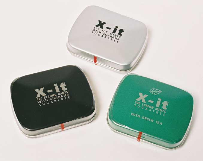 FRUITÉES Ces petites pastilles sans sucre sont à la menthe, au citron et au thé vert ou à la menthe et au guarana (ice et strong). X-it Lemon Mints, 1,75 €. Aux Galeries Lafayette Gourmet.