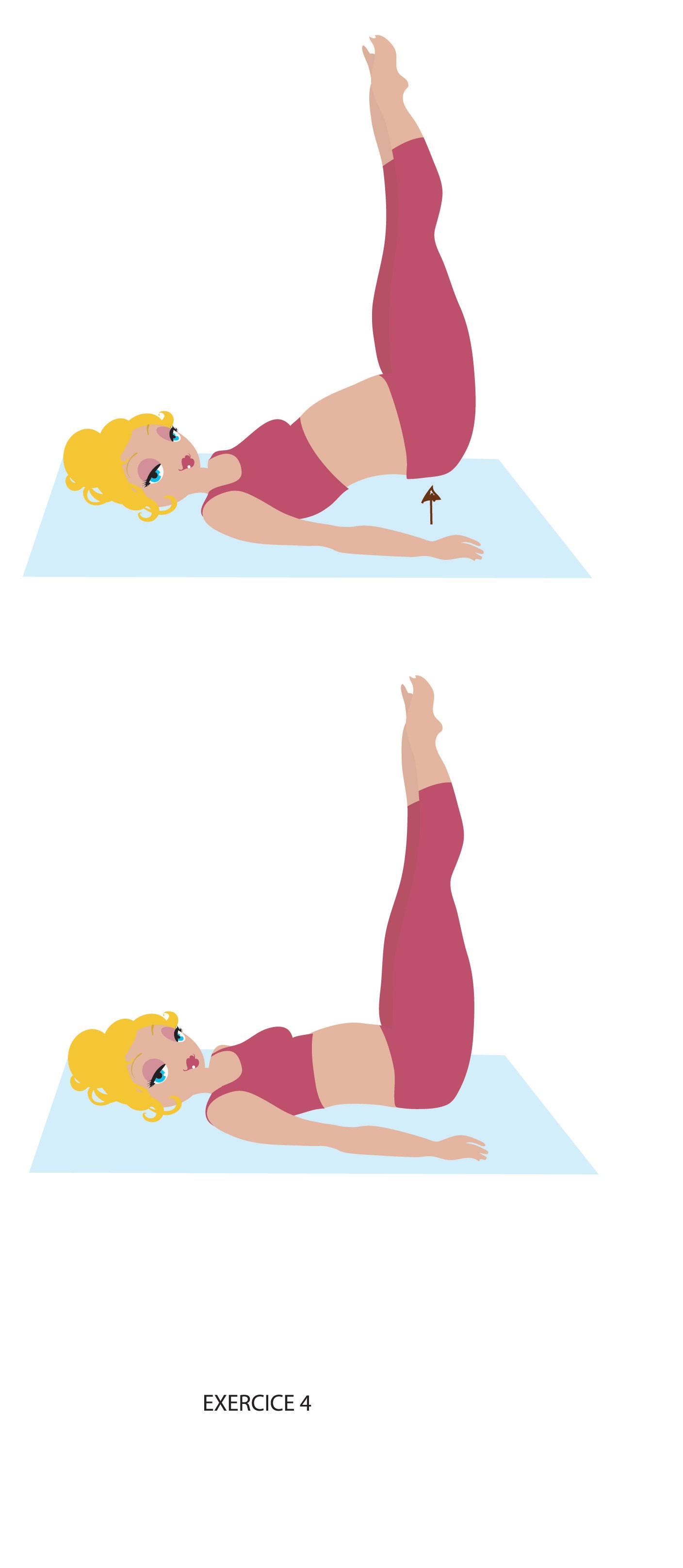 Allongée sur le dos, les jambes tendues au plafond. Décollez les fesses du sol, orteils pointés vers le plafond. Effectuez le mouvement en expirant. Pensez à bien contrôler votre descente
