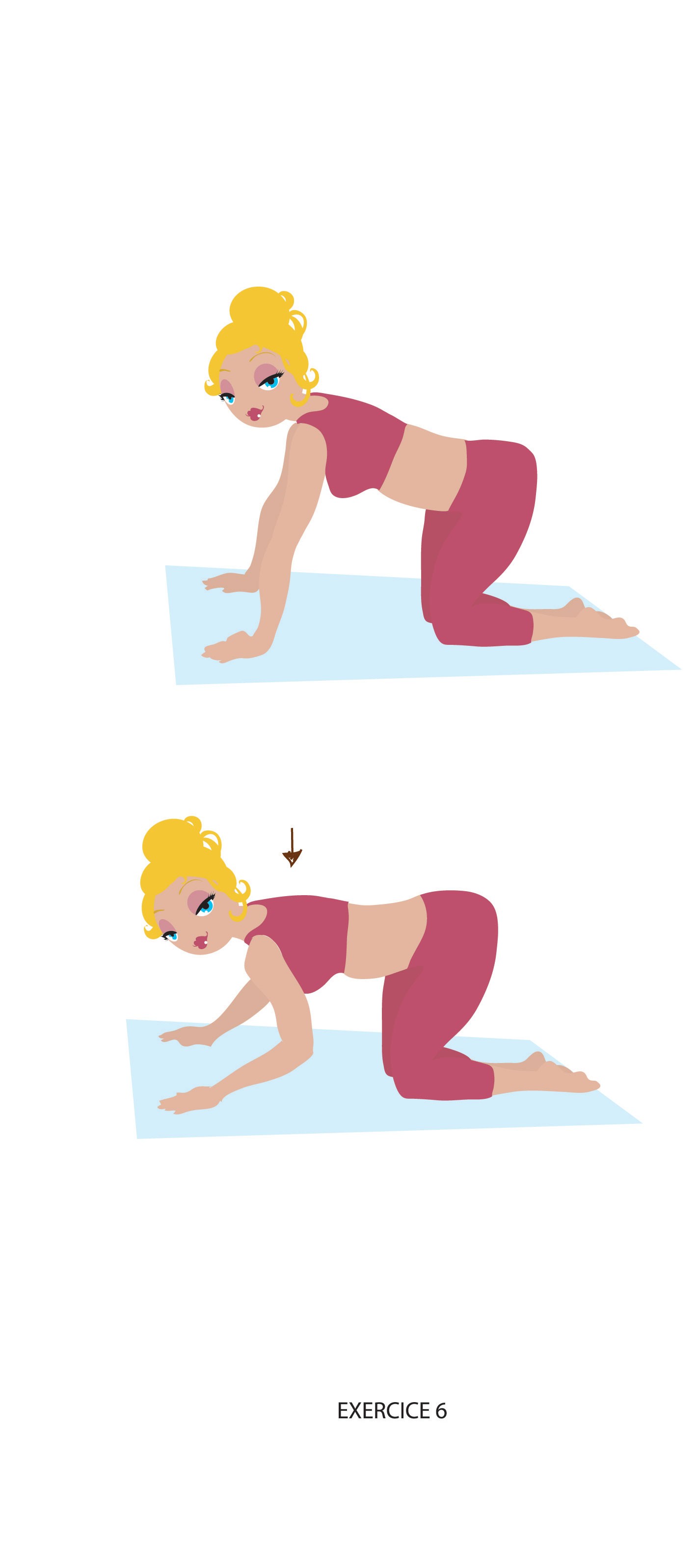 Mettez-vous en appui sur les genoux et les mains. Effectuez des flexions et des extensions des bras. Gardez bien votre alignement du dos sans relever la nuque. Expirez en allongeant les bras.