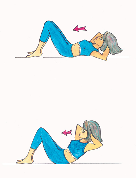 Le dos bien plaqué au sol, fléchissez vos genoux en veillant à ce qu’ils soient bien parallèles et desserrez. Vos pieds doivent rester bien fixés au sol. L’exercice consiste à monter le buste lentement afin de décoller les épaules du sol et de faire travailler le haut de vos abdominaux. Vos mains sont placées derrière votre tête, les coudes bien ouverts.