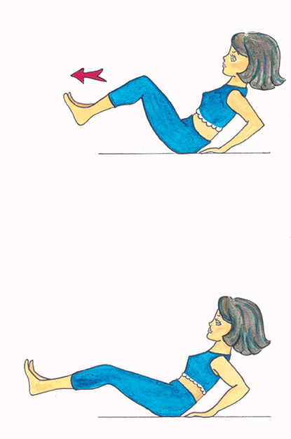 Dans la même position que l’exercice précédent. Placez vos talons à environ 20 centimètres du sol, vos genoux sont fléchis, vos pieds sont joints et en légère flexion. Vos mains doivent être en appui au sol derrière votre dos, les coudes fléchis et vos doigts orientés vers l’avant. Le dos reste droit et légèrement incliné vers l’arrière. L’exercice consiste à pousser lentement vos talons vers l’avant, comme si vous vouliez pousser un mur. Votre dos doit partir un peu en arrière et vos talons vont se relever de quelques centimètres. Ensuite, revenez à la position de départ et recommencez le mouvement 10 fois de suite. 30 secondes de récupération et effectuez encore une fois l’exercice (10 répétitions).