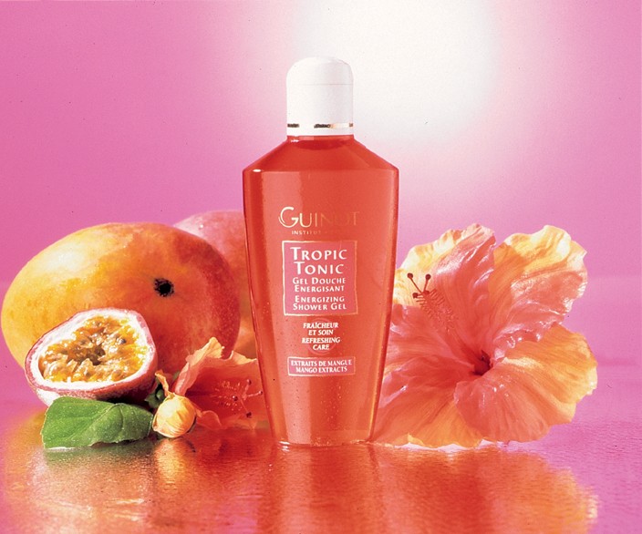 Un gel douche couleur orange tonique et énergisant, aux extraits de mangue et riche en vitamines et minéraux. Tropic Tonic, Guinot, 15,50 €.