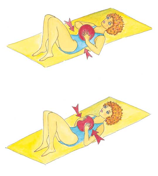 Allongez-vous sur votre serviette et fléchissez vos genoux en gardant les pieds au sol. Votre tête est posée sur le sable et votre dos est bien calé par terre. Prenez le ballon et placez-le au niveau de votre poitrine et le tenant avec vos deux mains. Vos coudes doivent être collés à votre corps.