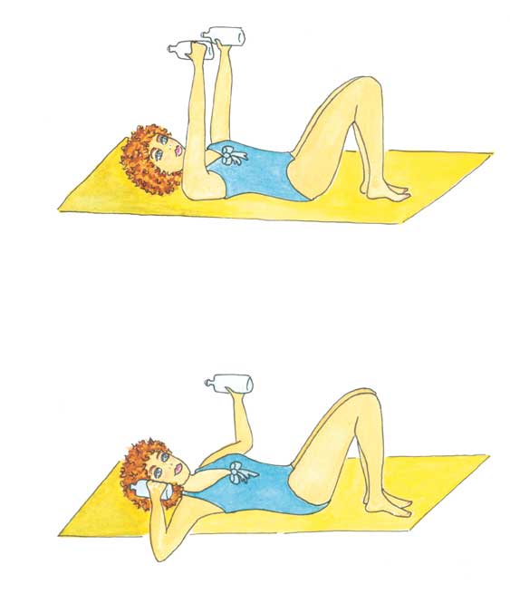 Positionnez-vous, les deux bras tendus avec une bouteille d’eau dans chaque main, au-dessus de votre poitrine. Les bras sont à la perpendiculaire du sol. Descendez lentement et simultanément vos coudes, afin de les amener sur le sable. Vos avant-bras, en position finale, doivent rester perpendiculaire à vos bras. Gardez la position et comptez jusqu’à 5, puis remontez jusqu’à la posture de départ et restez fixée 5 secondes.