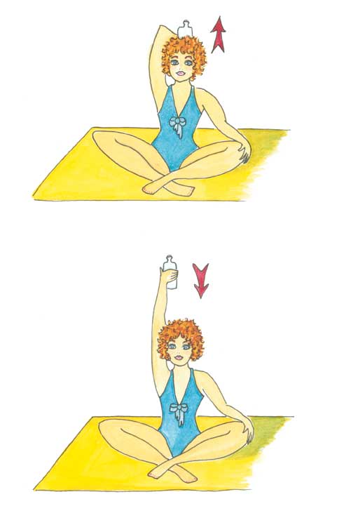 Placez-vous en tailleur (position du lotus). Prenez une bouteille d’eau dans votre main droite et amenez la derrière votre tête. Votre coude est alors dirigé vers le ciel (un beau ciel sans nuages, nous l’espérons !) et votre bras est fléchi afin de positionner la bouteille au niveau de votre colonne vertébrale. L’autre main reste posée sur votre cuisse. Veillez à bien garder le dos droit durant cet exercice.