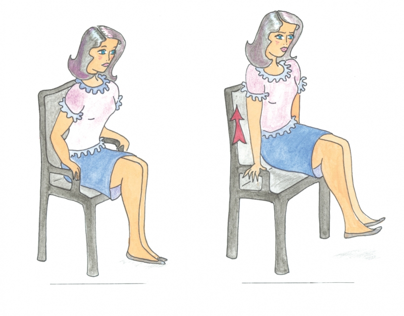 En position assise, mains posées sur les accoudoirs au niveau des épaules, relâchez le corps et grâce à l’appui et à une extension complète des bras, décollez les fessiers. Réalisez le mouvement sur 5 séries de 10 répétitions.