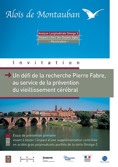 Unique en son genre en Europe, l’étude Aloïs de Montauban a été mise en place en 2006 par les Laboratoires Pierre Fabre en partenariat avec l’Assurance Maladie Midi Pyrénées et la ville de Montauban, sous le patronage du Ministère de la santé. Elle réunit 4000 personnes de la ville de Montauban, des deux sexes, de 67 ans et plus, qui seront suivies pendant 5 ans par les professionnels de santé de la ville. L’essai randomisé en double aveugle comparera ces personnes divisées en deux groupes et recevant soit des Oméga-3, soit un placebo. Les objectifs : tester l’impact d’une supplémentation contrôlée en acides gras poly-insaturés purifiés de la série Oméga-3 sur les maladies neurodégénératives, démontrer la diminution de fréquence des maladies neurodégénératives, et déterminer l’incidence des cas d’Alzheimer, des maladies neuro-dégénératives, cardio-vasculaires ou cérébro-vasculaires et des pathologies dermatologiques. À suivre…