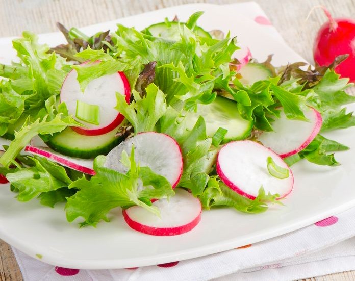 Hachez la laitue en lanières, tranchez les radis et hachez finement les petits oignons. Mélangez le tout, avec la crème fraîche. Poivrez, salez, et servez frais.