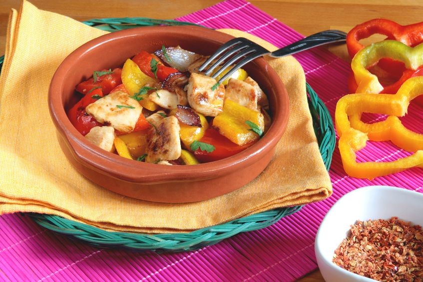 Coupez le poulet en fines tranches et assaisonnez-le avec le sel et le poivre. Dans une poêle, faites revenir les blancs de poulet avec le beurre et l'huile. Une fois bien dorés, retirez-les. Dans la même poêle, faites dorer les oignons. Pelez, lavez et coupez en lamelles les chiles. Mélangez-les aux oignons et faites-les revenir à feu moyen pendant 8 minutes. Mélangez quelques poivrons mis de côté avec le lait et le sel, jusqu'à obtention d'un mélange onctueux. Ajoutez la crème aigre et remuez le tout. Disposez la moitié des filets de poulet dans un plat et recouvrez-les avec la moitié des poivrons et la sauce. Répétez l'opération en faisant une 2ème couche. Saupoudrez de fromage et faites cuire environ 30 minutes jusqu'à ce que le fromage ait fondu.