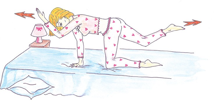 Mettez-vous à quatre pattes. Placez la main gauche à l’épaule gauche et le talon droit à la fesse droite. Inspirez et tout en soufflant, tendez horizontalement le bras gauche et la jambe droite.
