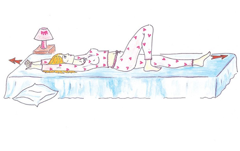 Allongez-vous sur le dos. Fléchissez la jambe droite et tendez la jambe gauche tout en gardant les pieds en appui sur le lit. Croisez les doigts et tendez les bras horizontalement derrière la tête. Inspirez et tout en soufflant, grandissez-vous.