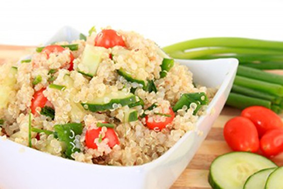 Faites bouillir l’eau salée. À ébullition, versez le quinoa et laissez cuire à couvert 10 à 15 minutes jusqu’à absorption complète de l’eau. Laissez-le gonfler dans la casserole. Pendant ce temps, coupez les tomates, le concombre et le poivron en petits dés dans un saladier, versez l’huile d’olive et incorporez les herbes hachées. Mélangez avec la graine de quinoa refroidie et assaisonnez. Placez au frais.