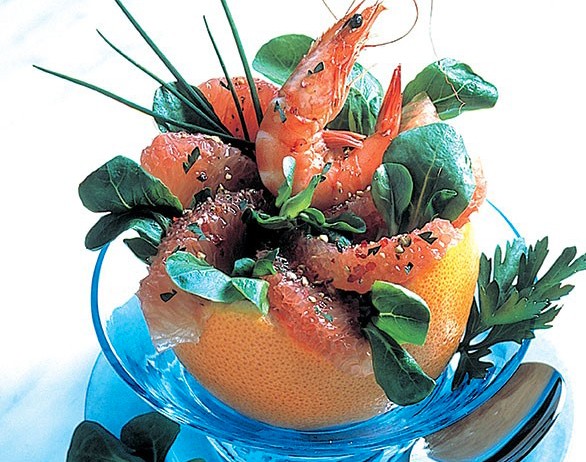 Coupez les pamplemousses en deux et videz-les. Coupez leur chair en morceaux, recueillez le jus, ajoutez le filet d’huile d’olive, le sel et le poivre. Réservez la sauce, rincez et égouttez la mâche. Garnissez chaque moitié de fruit de bouquets de salade et de morceaux de pamplemousse. Nappez de sauce et placez une crevette sur chaque demi pamplemousse.