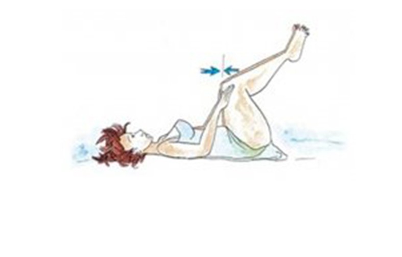 Dans le lit, allongée sur le dos, vous levez les pieds, rapprochez les genoux que vous allez placer sur la poitrine. Plaquez les deux mains contre les genoux qui vont essayer d’atteindre la poitrine tandis que les deux mains empêchent le mouvement par une force opposée.