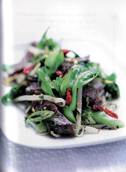 - Poêler rapidement les lamelles de bœuf, le brocoli et les pousses de soja avec l’huile. Ajouter au dernier moment les herbes, le jus de citron vert et les oignons nouveaux. Mélanger rapidement. Poivrer assez fortement puis ajouter le sésame et les baies de goji. Servir aussitôt.