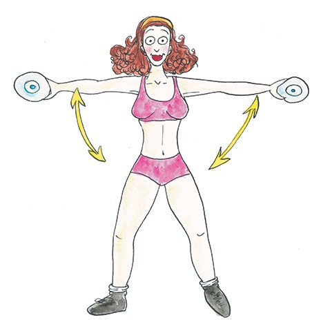Prenez une bouteille d'eau pleine dans chaque main et mettez-vous debout. Placez vos bras tendus le long du corps. Écartez vos pieds de 30 centimètres. Redressez le buste et rentrez le ventre. Inspirez, et tout en soufflant, amenez les bras en croix tout en les gardant tendus.