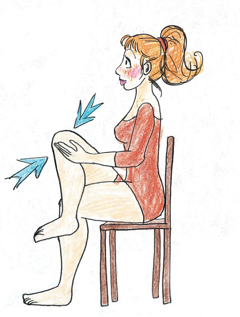 Sur une chaise, placez l’extérieur de la cheville droite sur le genou gauche. Posez la main gauche sur l’intérieur du genou droit. Gardez le buste droit. Essayez de lever le genou droit tout en exerçant une force inverse avec la main gauche afin d’empêcher le mouvement. Faites durer la confrontation de 5 à 10 secondes. Effectuez des expirations lentes entrecoupées d’inspirations rapides.
