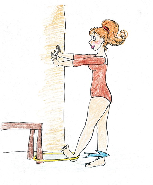 Debout, placez un élastique autour de votre pied droit et d’un meuble lourd et stable. Placez-vous de profil, à l’appui. Ecartez les pieds. Mettez-vous à la distance de l’appui fixe pour vous permettre d’avoir l’élastique tendu. En équilibre (vous pouvez vous aider en vous appuyant au mur), inspirez et tout en soufflant, ramenez le pied droit contre le pied gauche.