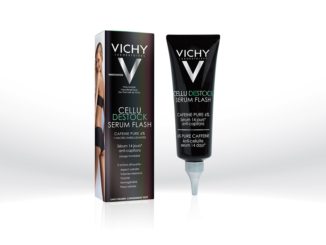 Flash comme son nom l’indique, le sérum flash Vichy Cellu Destock est un concentré d’attaque qui permet en 14 jours de retrouver une silhouette minceur. Composé de caféine pure dosée à 6% pour brûler les graisses et favoriser leur destockage, d’acide hyaluronique pour la fermeté et l’hydratation de la peau, ce sérum contient également des nacres embellissantes conférant une texture caramel dorée à la peau. 3 puissants actifs à leur plus forte concentration pour une action « flash » en 14 jours. À appliquer sur la peau propre et sèche, matin et soir, durant 14 jours.