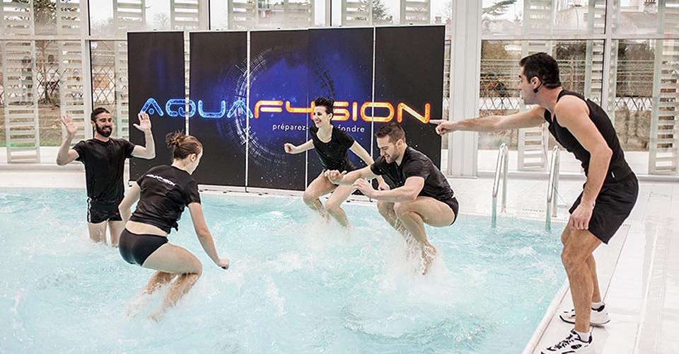 Musique entraînante, effets de lumière, bonne humeur collective, les éléments d’un bon cours de sport sont là mais pas question de bavarder car le coach est là qui veille, le cours bat son plein. Virginie qui vient de s’inscrire témoigne : « le plus fatigant, l’atelier cardiojump sur des aquatrampolines. Il suffit de sauter, en levant les genoux le plus haut possible et de rebondir. Très cardio, l’exercice aide au maintien et à l’équilibre, et renforce abdominaux, jambes et fessiers. Épuisant mais tellement marrant. »