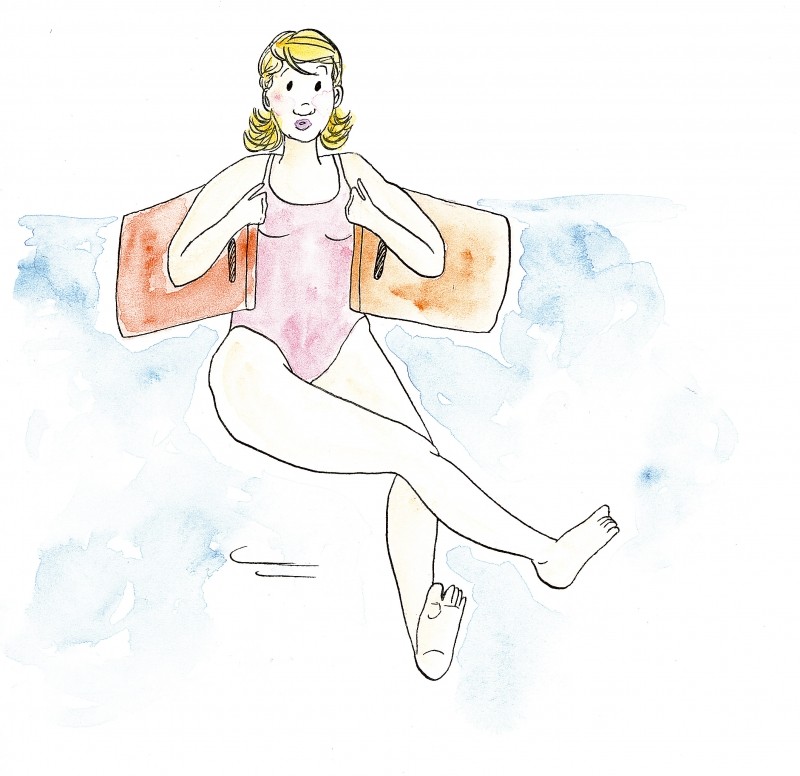 En eau profonde, en position verticale, placez deux planches sous les bras. Faites travailler les jambes en "ciseaux" en les levant bien pour flotter.
