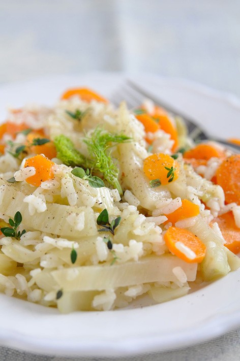 4/ Ajoutez le riz aux légumes, mélangez pendant 2 à 3 minutes. Salez éventuellement (le sel du bouillon peut suffire), poivrez.