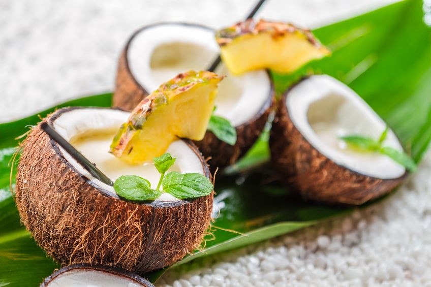 Versez les jus dans un mixer rempli de glace. Mixez et versez dans une demie noix de coco. Décorez avec une tranche d’ananas et des feuilles d’ananas.