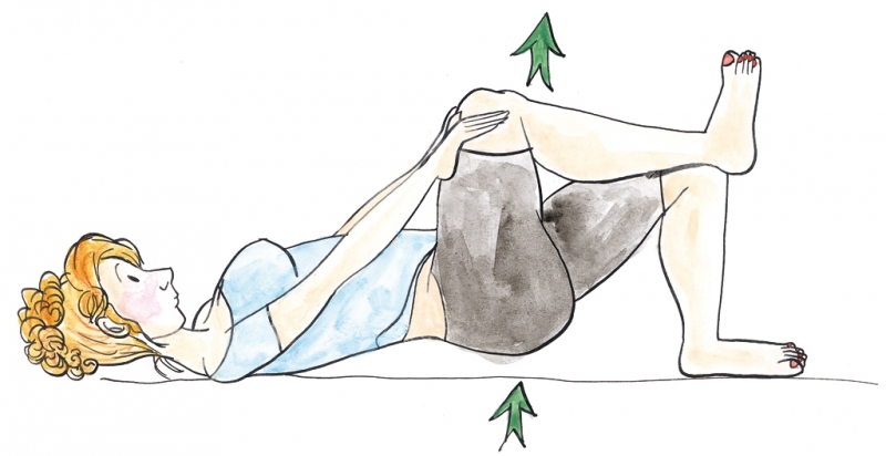 Restez allongée mais sur le dos. Décollez le pied droit et placez les deux mains sur le genou droit. Fléchissez la jambe gauche. Inspirez et, tout en soufflant, levez les fesses le plus haut possible. Simultanément, ralentissez le mouvement en résistant avec la force des mains sur le genou droit. Revenez à la position de départ sans reposer les fesses au sol. Recommencez jusqu’à atteindre votre limite et changez de côté.