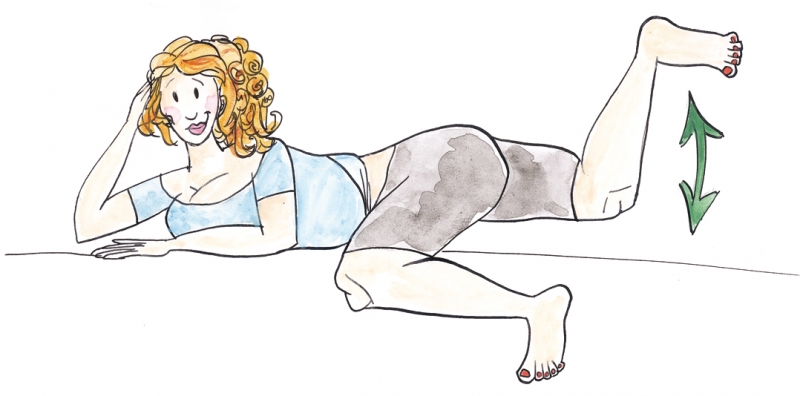 Mettez-vous sur le côté droit. Supportez la tête avec la main droite et placez la main gauche sur le sol. Amenez la cuisse gauche au sol, près de la poitrine. Fléchissez la jambe droite et levez le genou droit. Inspirez et tout en soufflant, tendez la jambe droite. Revenez à la position de départ sans reposer le genou au sol. Recommencez jusqu’à 20 fois avec chaque jambe.