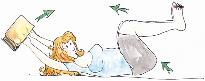 L’annuaire dans les mains, placez-vous sur le dos. Décollez les pieds du sol et amenez les cuisses près de la poitrine. Placez les bras tendus derrière la tête. Inspirez et tout en soufflant, amenez le botin au dessus de votre tête en gardant les bras tendus. Simultanément, décollez les fesses du sol. Recommencez entre 10 et 20 fois suivant vos possibilités.