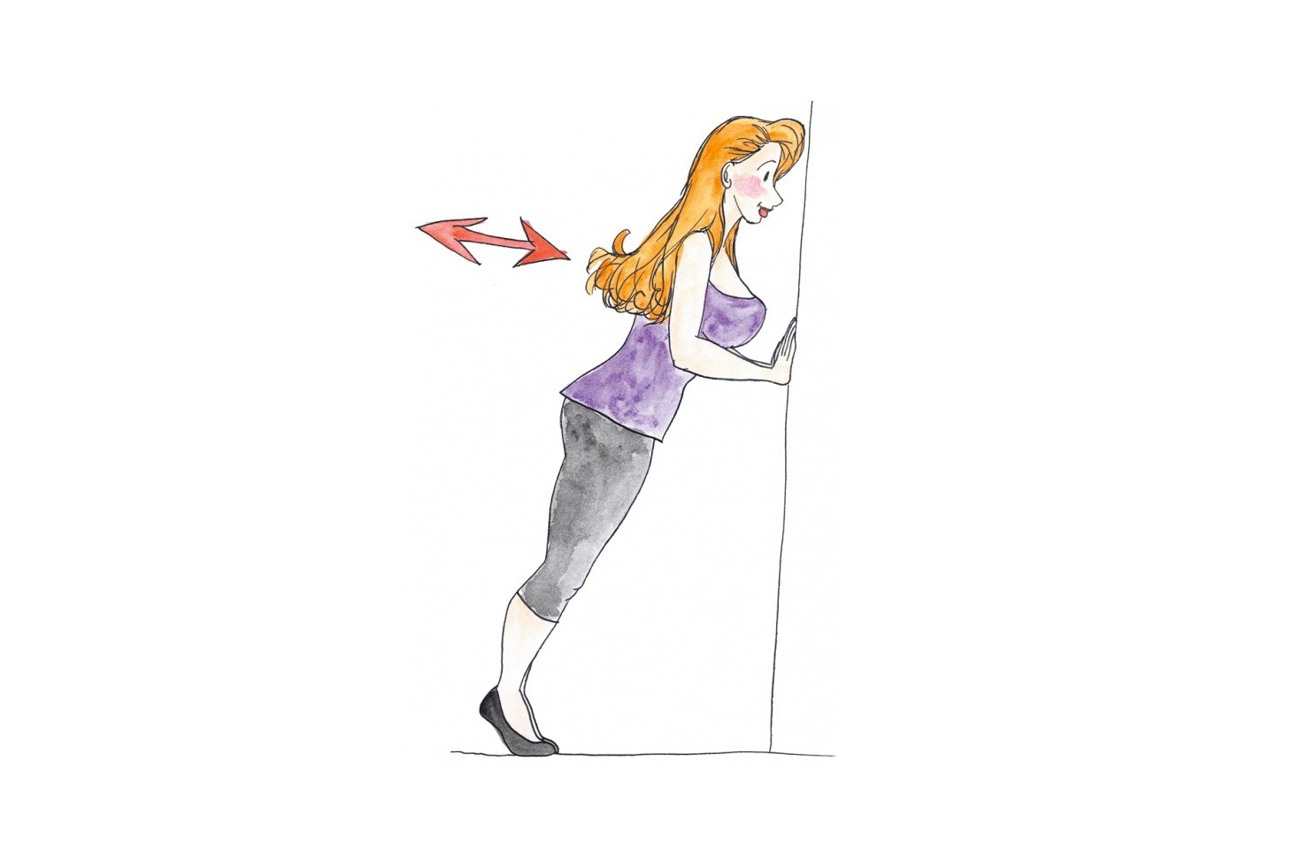Mettez-vous debout face à un mur. Placez les mains contre le mur à la hauteur de la poitrine. Reculez les pieds pour qu’ils soient à 1 mètre du mur.« En plus de faire travailler les muscles sous lesquels reposent vos seins, vous devrez effectuer des mouvements permettant de redresser votre buste et d’améliorer votre maintien. Ce qui aura forcément pour conséquence de redresser vos seins » Placez-vous sur la pointe des pieds. En poussant contre le mur avec les mains, fléchissez et tendez les bras pour avancer et reculer la poitrine du mur.